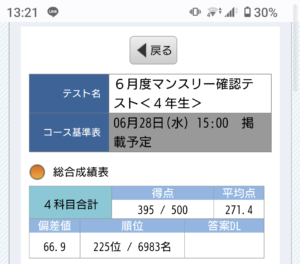 小4長男、6月度マンスリーを受けて帰ってまいりました。おつかれさん。昨夜の段階で答案がアップされており、ホントありがたい。自己採点結果は…。算数120(前回130)、国語100くらい(ほんとか…?前回78)、理科78(前回78)、社会91(前回78)。合計389くらいかな…(前回364)。算数の難易度が今回、高くないように感じました。それなのに、点数が伸びていませんね…。5月度マンスリー以降、家庭学習で算数をやっていないので、全統小のときも思いましたが、算数のカンが鈍っているような気がします。ミスでも10点ほど落としていました。算数伸びないと、小4長男の総点数は伸びないんだよな…。なんとなく、難易度が高くないのと失点の仕方にミスが多いことから、前回より偏差値は下がりそうな気がします。クラスは多分キープ(α下位)か?