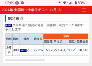 小1次男、11月の四谷大塚全国統一小学生テストを受験しました。