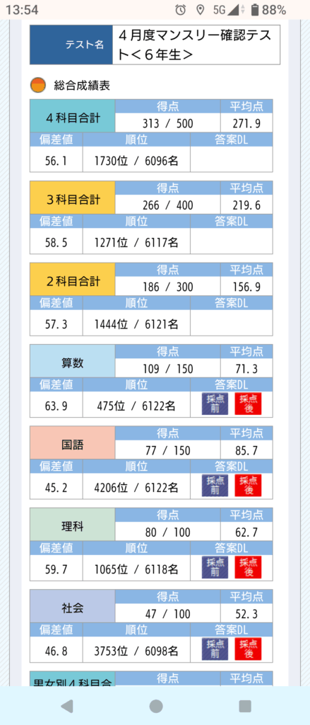 よくよく見ると、算数と理科の偏差値はいつもどおり。