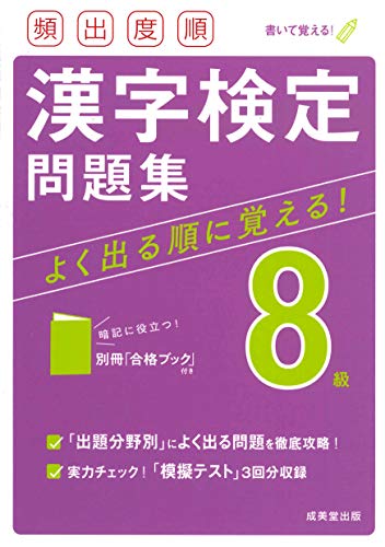 効率的に学習できる頻出度順問題集。過去問を徹底分析し、出題頻度順にABCの3ランクに分けて出題。辞書いらずの丁寧な解説付き。 実力チェック用の「模擬テスト」を3回分収録。 別冊の『漢字検定8級合格ブック』には、「配当漢字表」のほか役立つ資料が満載。 最新出題漢字に完全対応。
