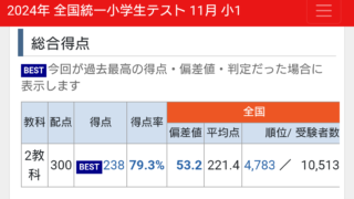 小1次男、11月の四谷大塚全国統一小学生テストを受験しました。対策ゼロ、受験は小1の6月と今回で2回目です。結果は以下。いかに私の次男への算数対策がスタートできていないか、はっきりした結果となりました。公文E(小5)まで行っていてこの結果。まずいな…と思って直近ではRISUに入会したりしていますが、結局タブレットに頼って時間をかけていないだけ。低学年の学習は母親が頑張らないとダメなんですよね、はぁ…。とはいえ、国語の点数がいいかもしれない。次男は長男とは違う受験になりそうで楽しみな気もします。